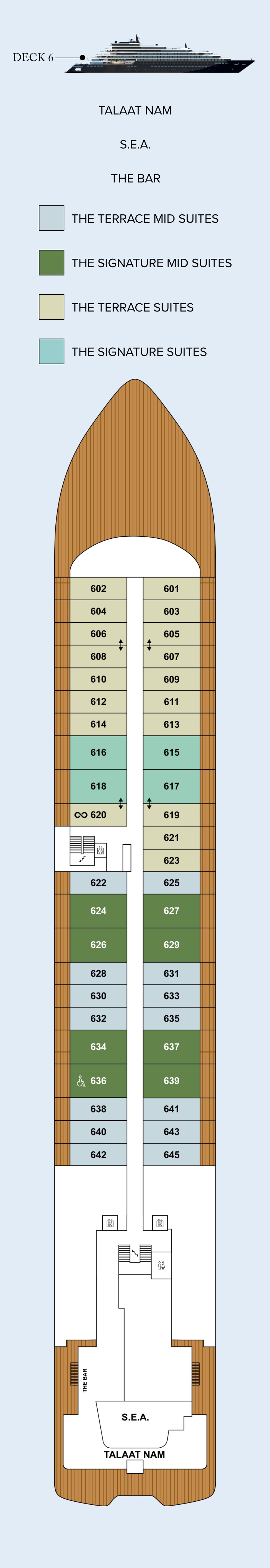 An outline of deck 6 of the ship. A corridor runs through the front portion of the ship, lined by terrace suites, signature suites, terrace mid suites and signature mid suites. The back third is terrace, location of S.E.A. and Talaat Nam dining venues.