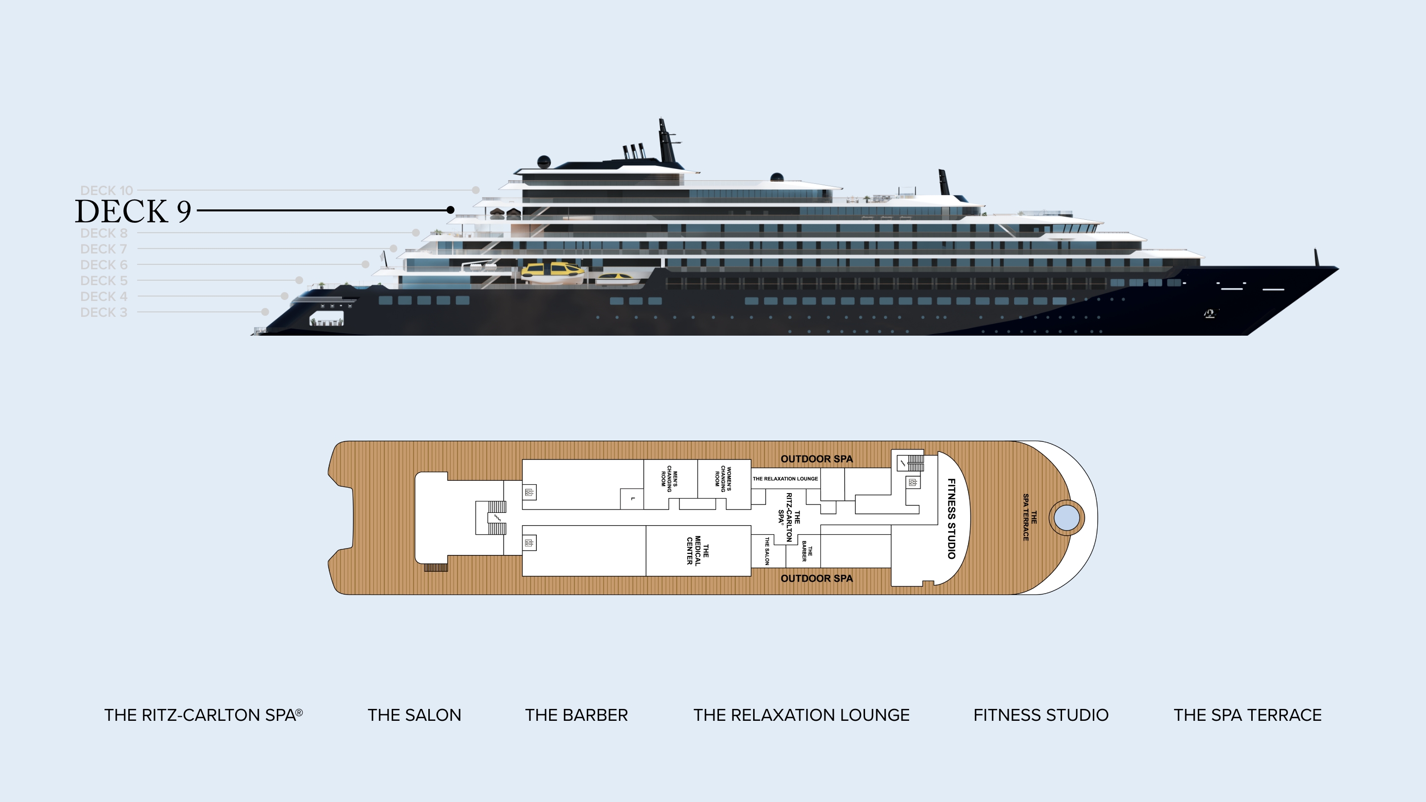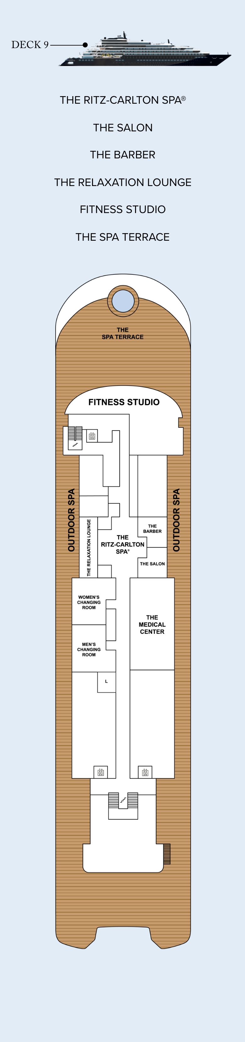 An outline of deck 9. In the forward is a large terrace, which the gym overlooks. Behind is the fitness center. Further aft is the spa, with treatment rooms, men's and women's changing rooms, salon, barber shop, medical center, non-guest space and terrace