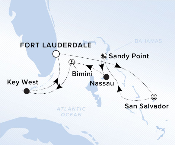 A map showing the Atlantic Ocean. A line showing the voyage route starts in Fort Lauderdale and goes to San Salvador, Sandy Point, Nassau, Bimini, Key West, and returns to Fort Lauderdale.