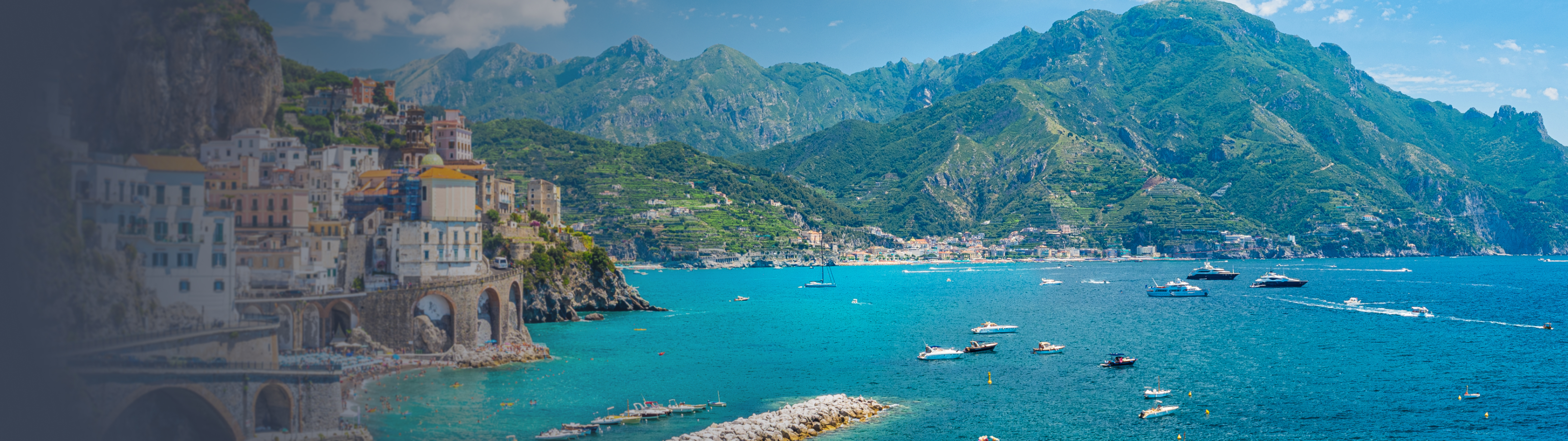 A view from atop the summit of rolling, verdant hills looking down to a blue ocean bay