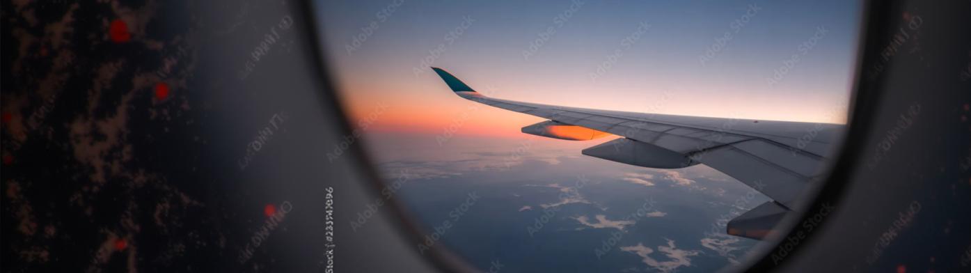 A plane taking off above palm trees.